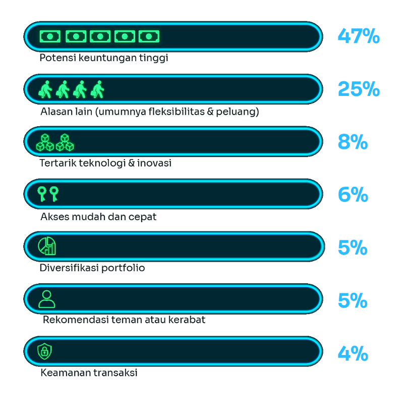 Motivasi utama berinvestasi kripto adalah potensi keuntungan tinggi (47%), serta pemilihan aset juga didorong oleh potensi pertumbuhan harga (43%).