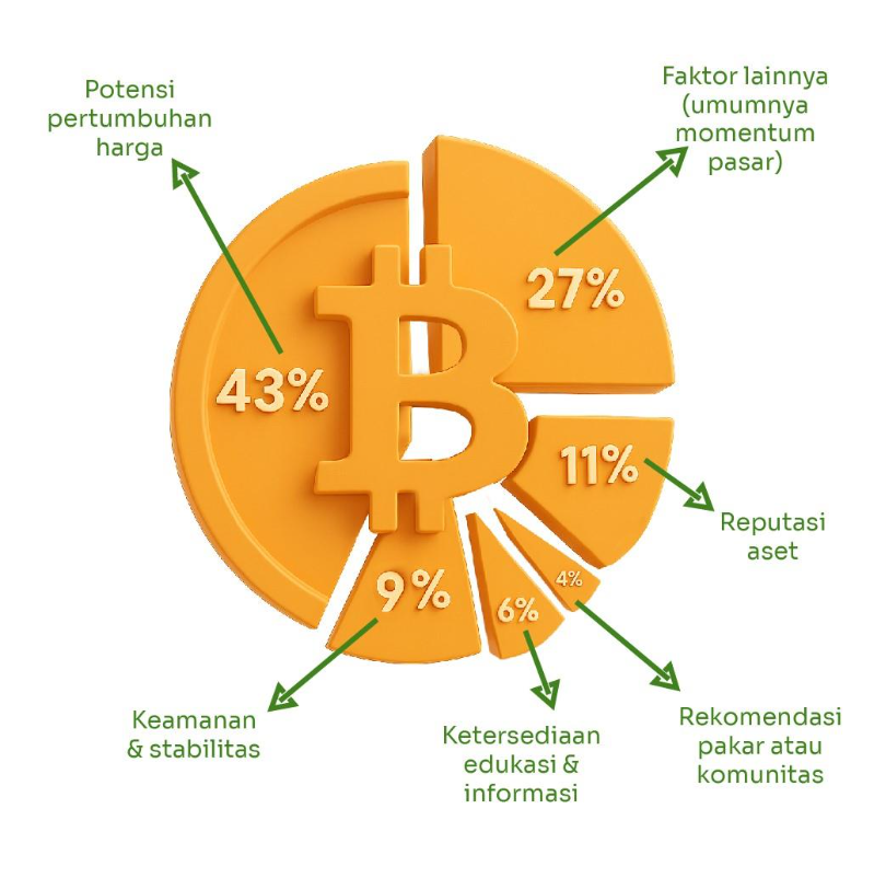 Motivasi utama berinvestasi kripto adalah potensi keuntungan tinggi (47%), serta pemilihan aset juga didorong oleh potensi pertumbuhan harga (43%).