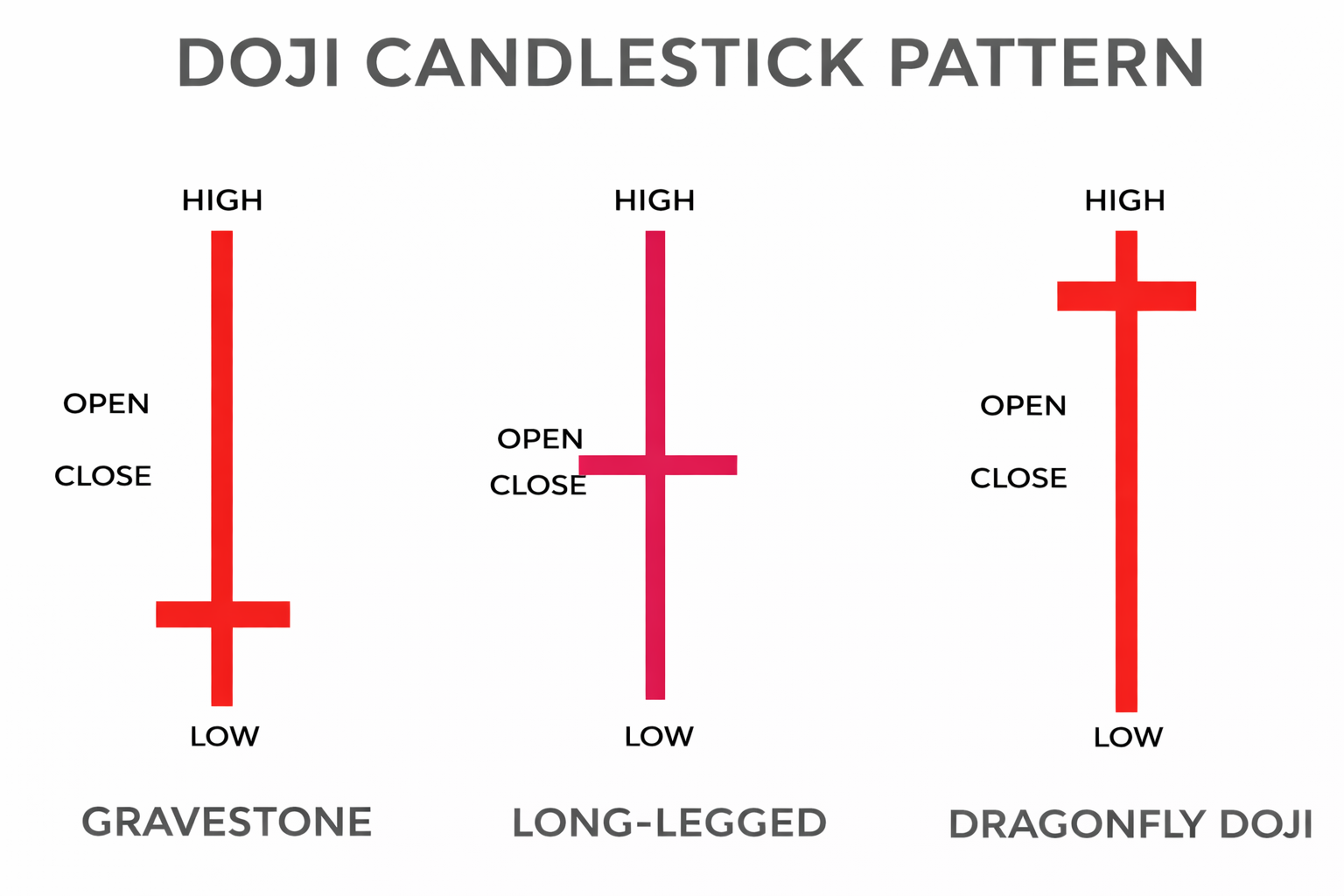Doji adalah pola candlestick di mana Harga pembukaan dan Harga penutupan hampir sama, sehingga badan candlestick tampak sangat kecil atau hampir tidak ada. Doji seringkali menjadi sinyal bahwa pasar sedang dalam kondisi ragu-ragu dan tidak ada dominasi yang jelas antara pembeli dan penjual. Jika muncul setelah tren panjang, Doji bisa menjadi pertanda potensi pembalikan arah, baik Bullish reversal maupun Bearish reversal.